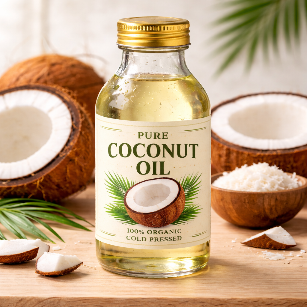 Cold-pressed virgin coconut oil extracted using traditional methods to retain natural aroma and nutrients.